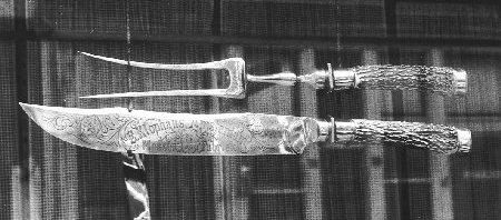 Het handgesmede voorsnijmes met vork, door Jacob Klophaus in 1907 voor zijn zoon vervaardigd in Solingen. Klaas H. Rob, april 1986.