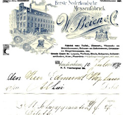 Wat een prachtige briefhoofden in die tijd. Zoals die van de Eerste Nederlandse Messenfabriek W. Beien en Co., N.Z. Voorburgwal 264. Zij leverden de eerste Gillette-apparaten in 1909. In 1910 kwamen de eerste Zweedse dolkmessen binnen. Op een faktuur van Colgate & Co van 1915 wordt 2�% oorlogstoeslag berekend.