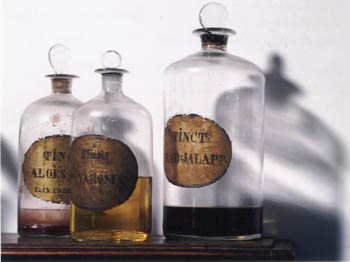 Flessen uit de periode Everwijn & Meijer, plm. 1850, waarin Tinctuur Radix Jalapae, Spiritus Polyaromaticus en Tinctuur Alo�s ofwel Elixer Proprietatis. Het laatste was een nogal drastisch laxeermiddel.