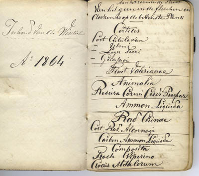 Boekje met �Inhoud van den winkel� uit de tijd van Everwijn Meijer, anno 1864. �Van hetgeen in de flesschen en doozen is� op de planken, in de kasten en in de laden onder de toonbank.